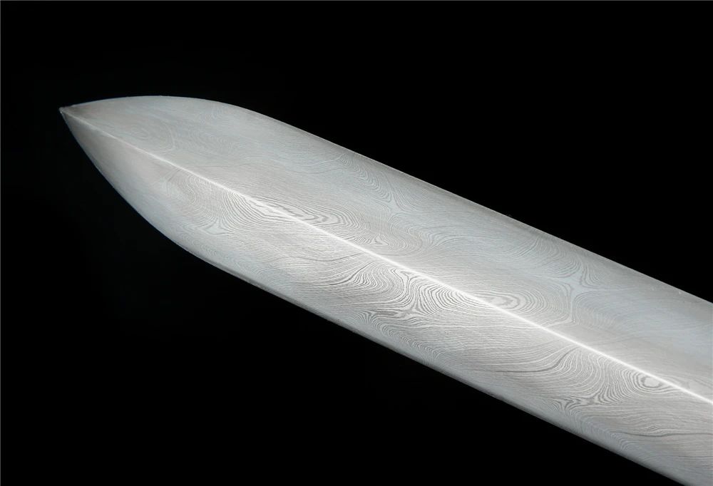 此款宝剑,龙泉宝剑厂引用清剑形制,锻造一堆宝剑,以白铜刻画纹饰,均为百炼钢锻造,一为羽毛纹,一为璇打纹,做工极为精湛!