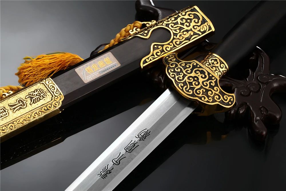 此款宝剑,以上等毛铁锻造,手工精研,八面剑型,黄铜雕装,剑装表面镀金,铭文“龙泉宝剑”,此剑为张叶胜大师所制,工艺精湛,外观精美,收藏极为霸气!